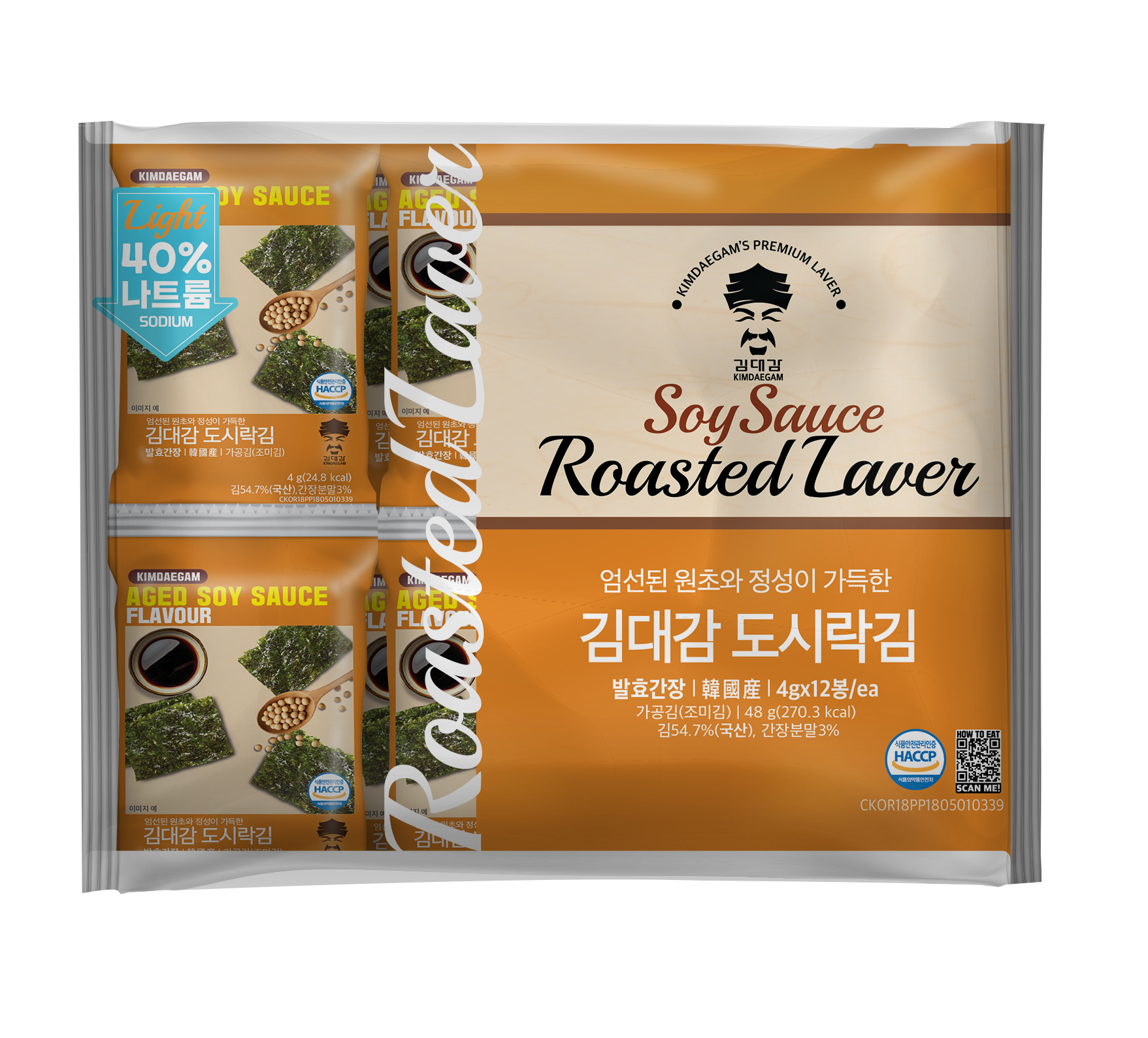 소금을 전혀 사용하지 않고 발효 간장 만을 사용하여간을 맞춘, 나트륨을 획기적으로 줄인 김입니다.발효 간장을 분말 형태로 가공하여 전혀 눅눅하지 않고 바삭함을 유지합니다.